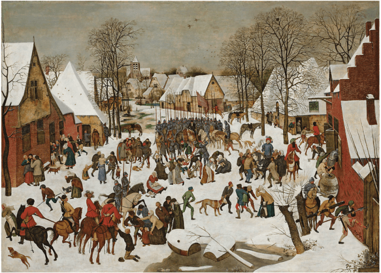 “The form of the signature on the major versions is considered to be of significance in placing them within the chronologies of Pieter the Elder’s and Pieter the Younger’s oeuvres. The Royal Collection picture is signed ‘BRVEGEL’, which is now accepted as the Elder’s signature; the Vienna version is signed ‘BRVEG’ at the extreme right edge, although the letters ‘EL’ or ‘HEL’ may have been inadvertently trimmed off; a version in Bucharest is signed ‘P. BRVEGEL’. At the time of its sale in Paris in 1979, the present version appears to have born a fragmentary date in addition to the signature, ‘.BRVEGEL. 15..’ (see Campbell, op. cit., p. 15). We are grateful to Christina Currie of KIK/IRPA for noting that the present version is unusual in that it is signed with the signature form of Bruegel the Elder after 1559, ‘.BRVEGEL.’ without an ‘H’ and without the initial ‘P’. No other versions of the Massacre of the Innocents are securely known to be signed in this way; the implications of this for its primacy in the sequence of versions painted by Brueghel the younger remains to be established.”
