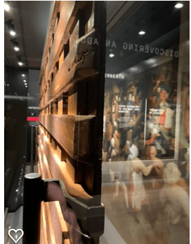 What makes this exhibit particularly striking is the presentation of the painting in an enclosed glass case, allowing it to be viewed from the back and sides (see photos). This provides the viewer an ability to closely view the thin board on which this masterpiece was painted.