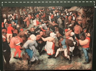 Bruegel used a variety of methods to paint his monumental panel paintings. For example, compared to Dulle Griet, the Detroit Wedding Dance, was drawn free hand using an “extensive and vigorous drawing with numerous adjustments to the modeling and shading of the figures, but not the composition as a whole.” Another surprise is the finding that the Wedding Dance was altered from its initial composition size through the addition of a top border. This is discussed in an intriguing paper by Marie Postec and Pascale Fraiture that compares the Detroit version with a little studied copy after Bruegel the Elder in Antwerp.