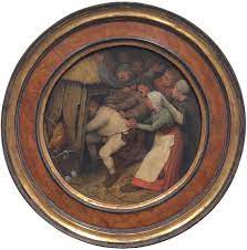 Particularly interesting is the smaller, round version of the painting, said to have been painted by Brueghel the Younger later in his career, using free hand, and not a cartoon. This version depicts the two peasants with much smaller heads, in a loose, free-hand manner.