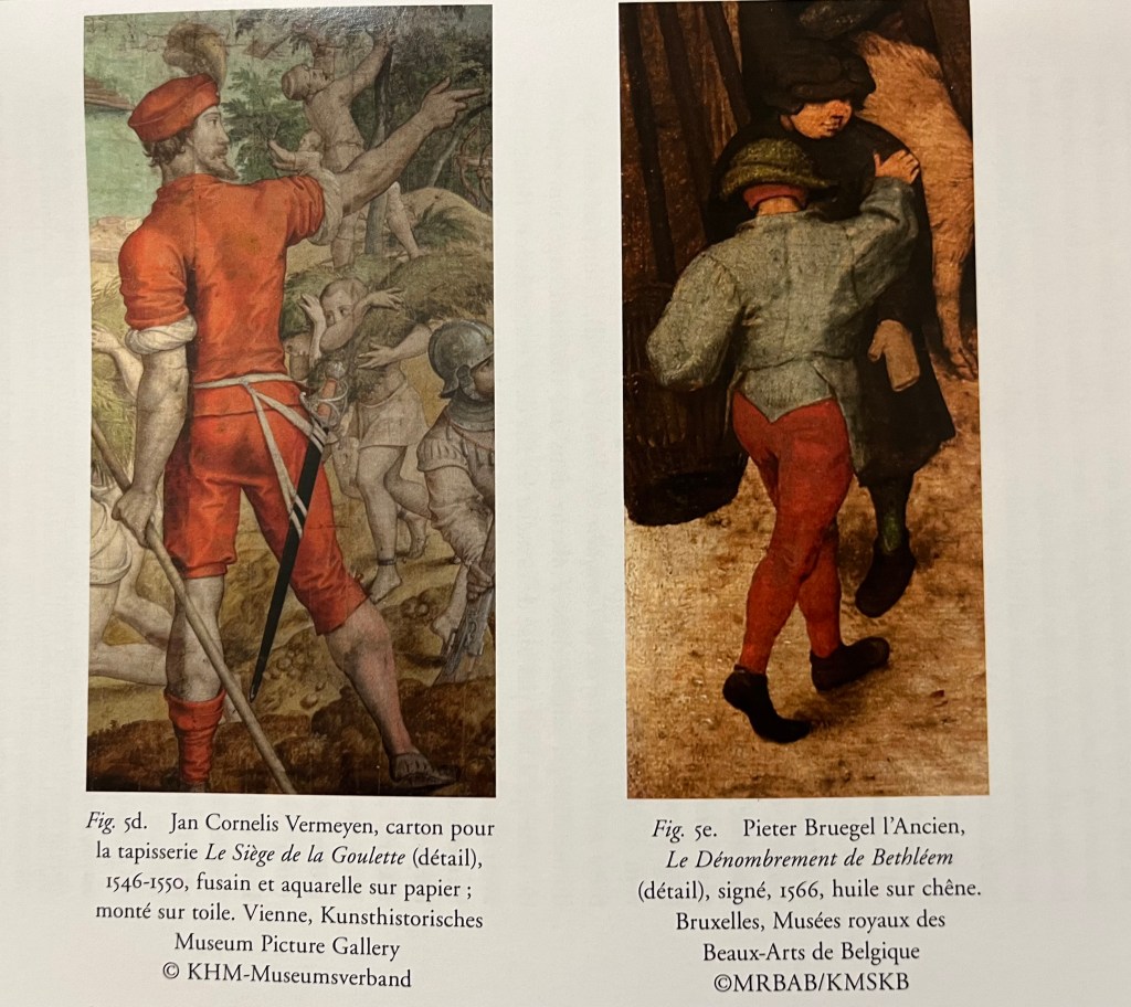 The book makes the case that Bruegel did not go to Italy to simply become familiar with ancient and modern Italian art, but instead to incorporate Italian aspects into his works. The monograph looks to reformulate Bruegel’s relation with the country as a reciprocal exchange, meaning, for example, that Bruegel was influenced by Italian art, and then Bruegel’s drawings and paintings went on to influence later Italian artists. The authors make the case that a profound impact of his time in Italy was manifested in his late panel paintings, with their large figures and energetic movements. Brueghel was likely influenced by the Italian tapestries that he viewed, with their lively, vibrant figures impacting Bruegel’s sequencing of figures in motion. An example of this possible influence is below.