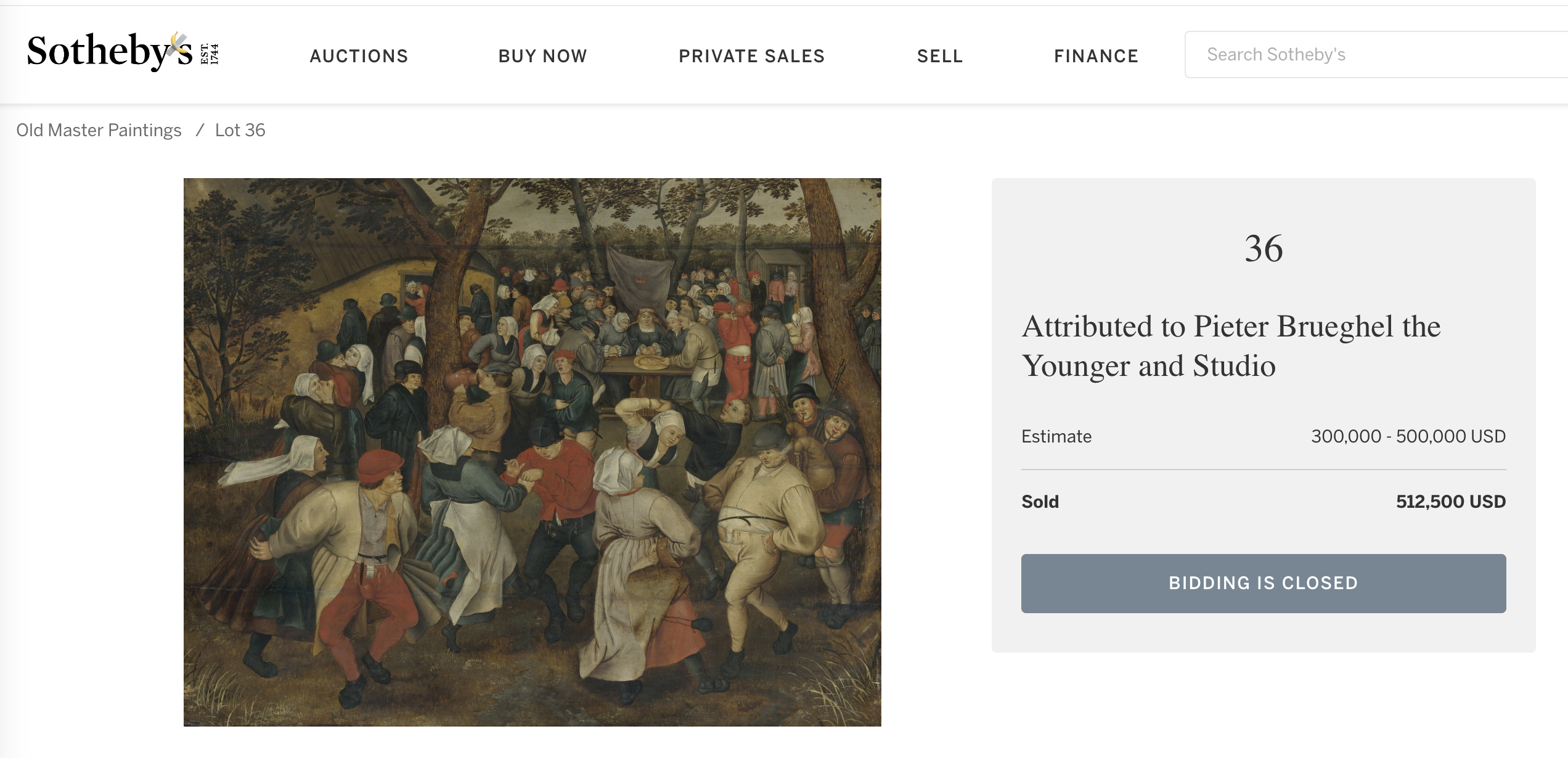 A very nice version of “Wedding Dance in the Open Air” by Pieter Brueghel the Younger is coming up for auction shortly at Christies Paris on November 21, 2024 in the auction “Maîtres Anciens : Peintures – Dessins – Sculptures” (Live auction 23018). (This work is called “The Wedding Dance” in this auction.)